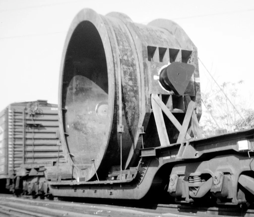 This load is a model of the upper half of a molten steel ladle being shipped on a Reading GSC depressed center flatcar (see 1964 picture below). The upper section will be joined to the bottom bowl section of the ladle at the delivery site and put into service. This model load comes complete with the ladle section, base cribbing, side braces and 0.4mm tie-down wire for mounting to a flatcar. The model parts come fully painted and ready for use. Below is a photograph of a nearly identical ladle which had been in factory use and is in the process of being cleaned. This load will be correct for steel operations in nearly all eras Also, we have included a photo of the load installed on a Classonemodelworks.com GSC flatcar to illustrate the finished result after mounting.