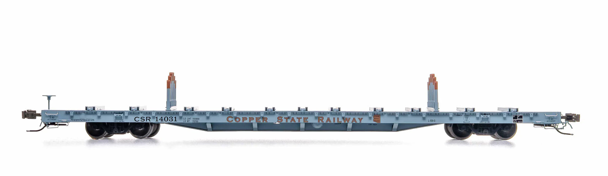 These freshly rebuilt cars sport the famed Desert Sky blue base color scheme and Metallic Copper lettering with a gleaming white deck. This CSR car also features the rebuild Banna Steel Car Co. logo as an homage to this freelance road's original creator, Brian Banna. The last run of Copper State Railway freight cars went fast so be sure to get your steel hauling finger rack flatcar from Home Shops today!