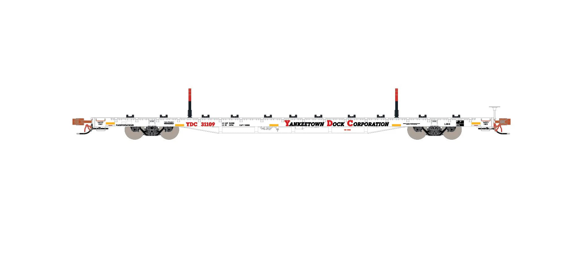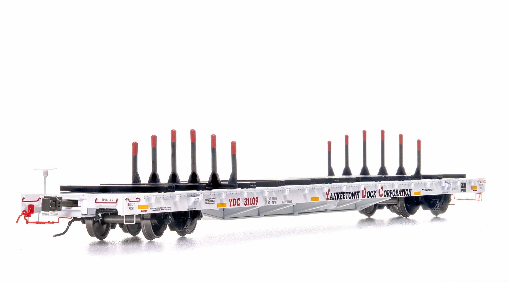A striking white body and the modernized Yankeetown Dock Corporation lettering adorn this car along with the conspicuity stripes, making it the most modern offering of our finger rack flatcar release!