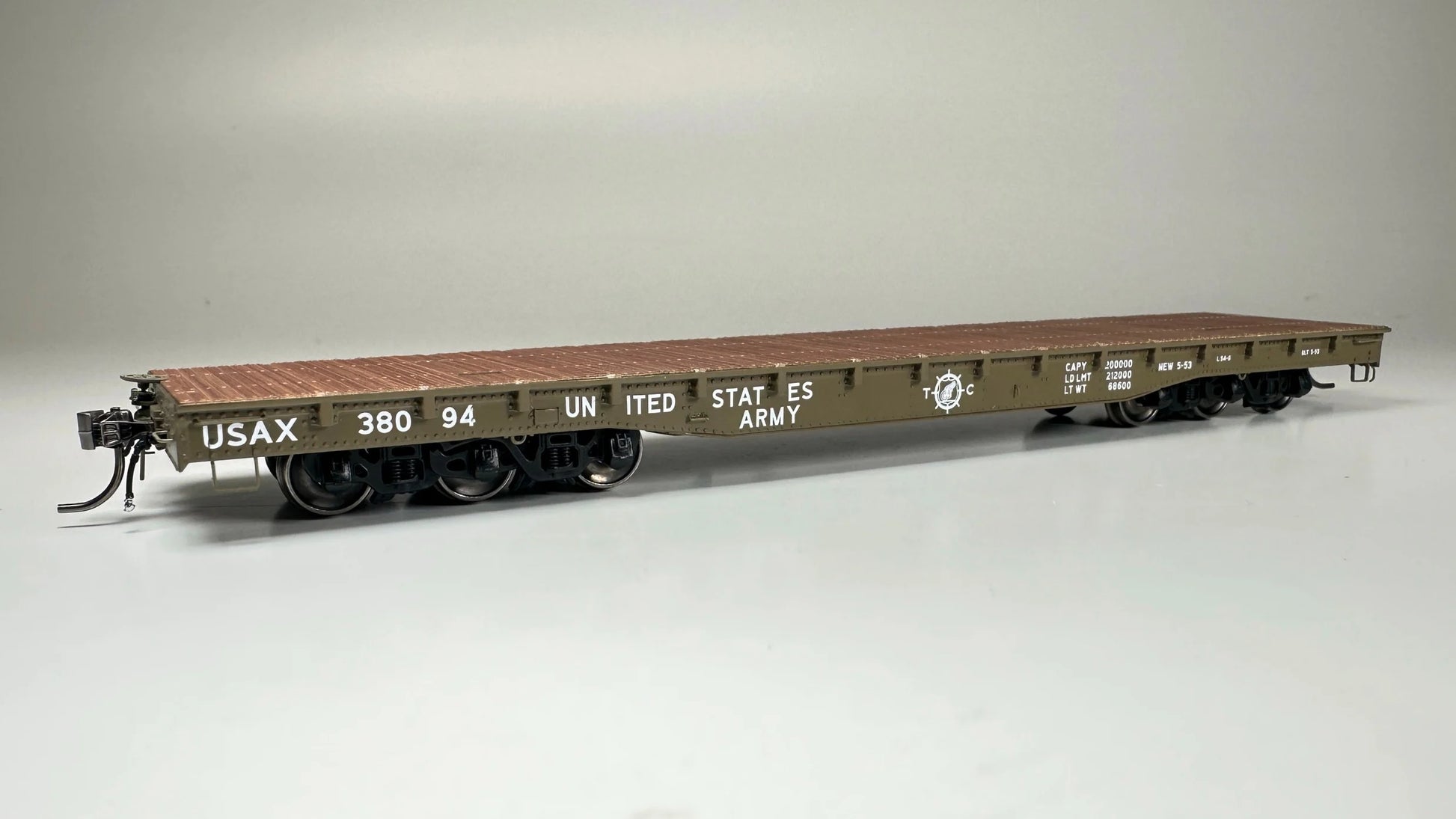 At the height of the Korean War, the US Army required a new fleet of rolling stock to transport military hardware across the nation on any railroad. Notably, a large order for 650 cars was placed with the Magor Car Corporation to handle the heavier and larger tanks and other military equipment of the era. Delivered between April and July 1953, the Magor fleet came in at 54’ and weighed in at around 36 tons with a 100-ton load carrying capacity. Features included a wood deck and heavy steel frame construction along with 6-wheel buckeye trucks.