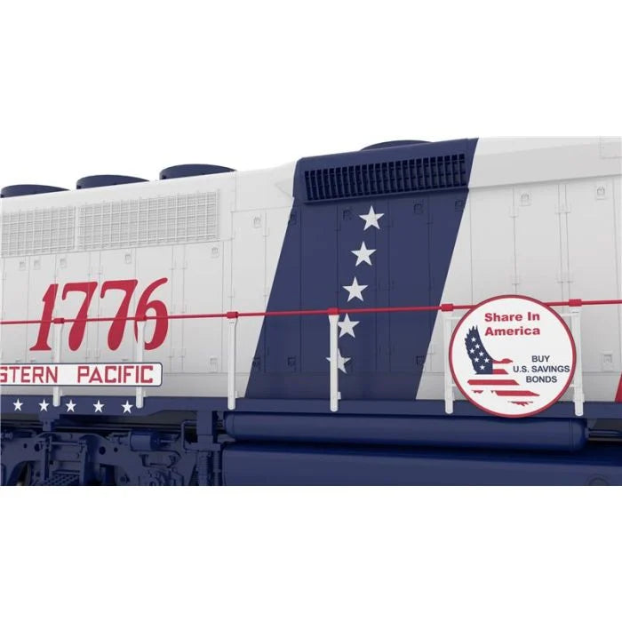 In March of 1976, Western Pacific chose GP40 number 3540 to repaint into the special red, white and blue scheme. This would become the 1776, featuring the "Betsy Ross" flag in a slight wave pattern on the cab sides. The 1776 also featured roundels on the long hood walkways. Out of the paint shop, the both sides sported the Great Seal of the U.S. Later, WP interchanged these with a Liberty Bell and US Bonds design. You'll get ALL FOUR roundels with this unit!