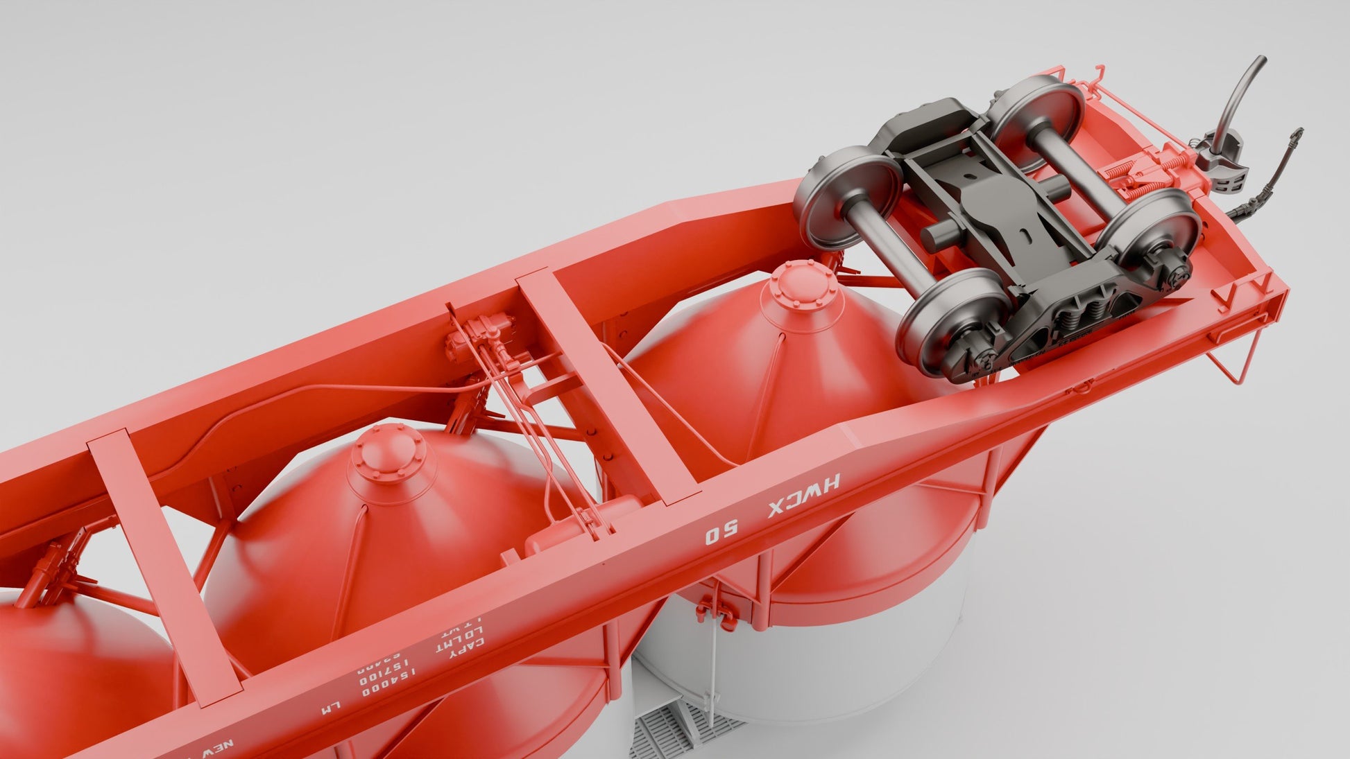 Externally, this car had a shape never seen before in railcar history. Instead of the common, angled hopper bays, these cars featured three vertically mounted cylindrical tanks. These tanks were placed on a flatcar-like platform with a brakewheel at one end and vertical handrail supports on both ends. They measured 43’7” in length with a 70-ton capacity and 2,400 cubic feet of volume.